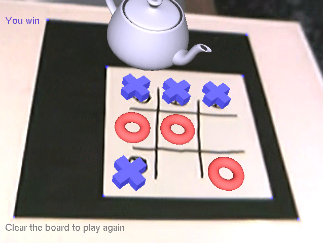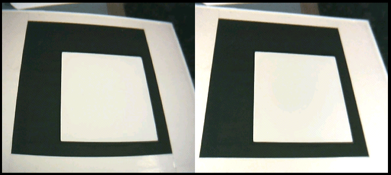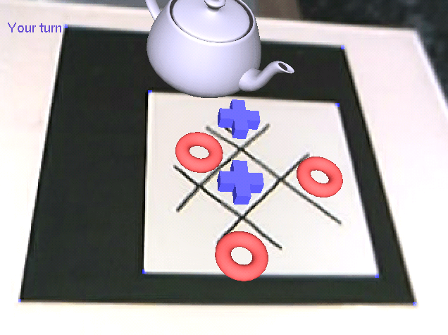 A aplicação utiliza o modelo para fazer a calibração de câmera, deixando a câmera em um ponto fixo. As bordas são detectadas utilizando um algoritmo que descobre componentes conexas na imagem resultantes do Canny. Este algorito considera apenas componentes maiores que um certo número de pixels por componente. Também sabe a direção da normal de cada pixel. A idéia original era utilizar o número de pixels em cada direção para determinar se a componente era uma das duas componentes fechadas ou não. Porém não deu certo. Então a aplicação está pegando as duas primeiras componentes maiores que o threshold como as duas componentes conexas e fechadas do padrão. Como o padrão é grande para a pessoa poder jogar, este não é um problema. A aplicação também guarda o número de pixels que cada componente possui. Após a calibração, o usuário está livre para jogar. O usuário desenha a tralha do jogo em cima do modelo para começar o jogo. A aplicação reconhece a tralha utilizando a transformada de Hough. Ao achar as quatro linhas, ela pega os quatro pontos de interseção e leva da imagem para o espaço da câmera no plano z=0. Então calcula os pontos sobre os quais o usuário tem que jogar e leva devolta para coordenadas da tela. Quando percebe que uma região para jogar está escura, assume que o usuário jogou ali. Para detectar se o usuário está com a mão em cima do modelo, verifica se o número de pixels das componentes do modelo mudou. Se o número pixels nas componentes mudaram, o usuário está com a mão na frente. Ao final do jogo, o usuário deve limpar todo o modelo para começar novamente. Isto é feito verificando se não há nenhuma linha de Hough dentro do modelo. O código fonte está disponível abaixo. |