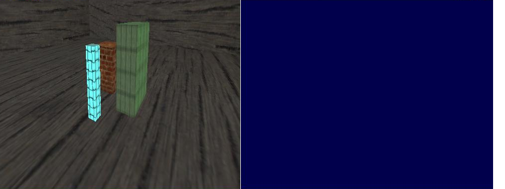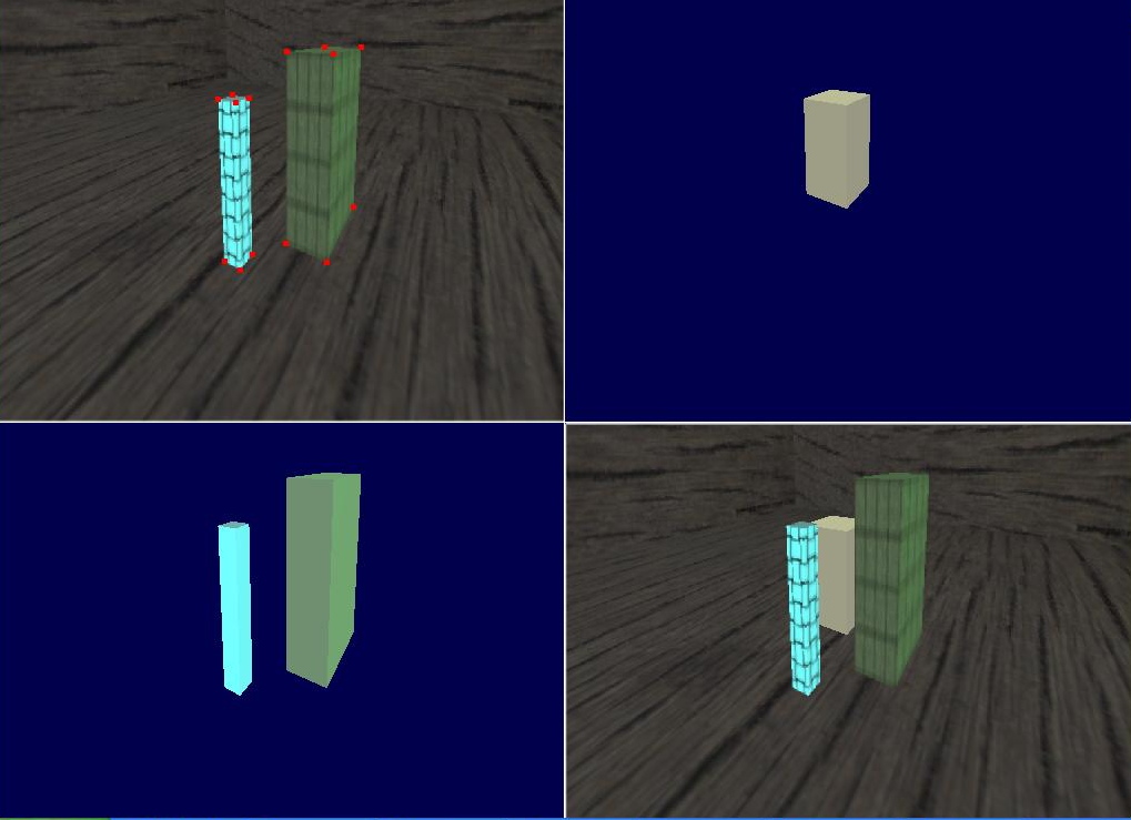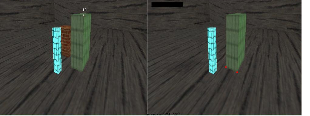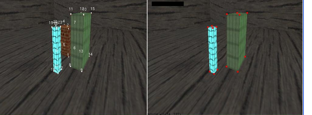 Na Calibração, a tela inicial é: Nessa tela, é possível visualizar no lado esquerdo o modelo 3D da cena a ser reconstruída. Pode-se usar as setas direcionais do teclado para fazer a movimentação da cena da forma desejada. Depois de se escolher a visão preferida do modelo, parte-se para a opção de escolher qual box deseja que fique na imagem. Cada box é identificado por um número de 1 à 9. Assim, quando um número é pressionado, o box some da imagem, como abaixo: Depois de selecionado quais boxes da cena deverão continuar, o programa permite tirar uma foto do modelo pressionando F10. A foto da imagem será necessária fazer a seleção dos pontos de correspondência entre o modelo e a imagem, como visto na imagem abaixo, onde os pontos vermelhos na imagem do lado direito significam pontos clicado no mouse. Quando a tecla F10 for presionado, terá início um tutorial para coleta dos pontos do modelo. Aparecerá na tela da esquerda, números indicando onde se encontra no tutorial. Se o ponto correspondente no modelo for visível na imagem, deve-se selecioná-lo com o mouse na região da direita. Cada vez que esse processo for feito, será desenhado um ponto vermelho na imagem onde foi clicado. As opções de interatividade aqui são: Tecla "n" avança para um próximo ponto do modelo, usado quando o ponto correspondente não estiver visível. Clicar com o mouse em um ponto da imagem também avança para o próximo ponto do modelo automáticamente. Opção extra: Existe a opção de deixar o programa calcular o ponto de correspondência na imagem teclando "h". Assim não é necessário usar o mouse. O cuidado que se deve tomar e de não usar as teclas direcionais se for usar a opção de "h". Também existe a opção de teclar "r" para resetar tudo e teclar F9 para visualizar o modelo em wireframe. Ao fim da seleção, será exibido no modelo todos os pontos, como na imagem a seguir: Nesse momento, deve ser executado a calibração, teclando "c" e passando automáticamente para a etapa de visualização. Na Visualização poderá ser verificado os resultados da execução do programa. A figura a seguir ilustra o processo: Essa tela contém 4 espaços: