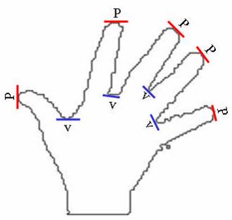 objetivo: as pontas dos dedos (picos, P) e a junção entre os dedos